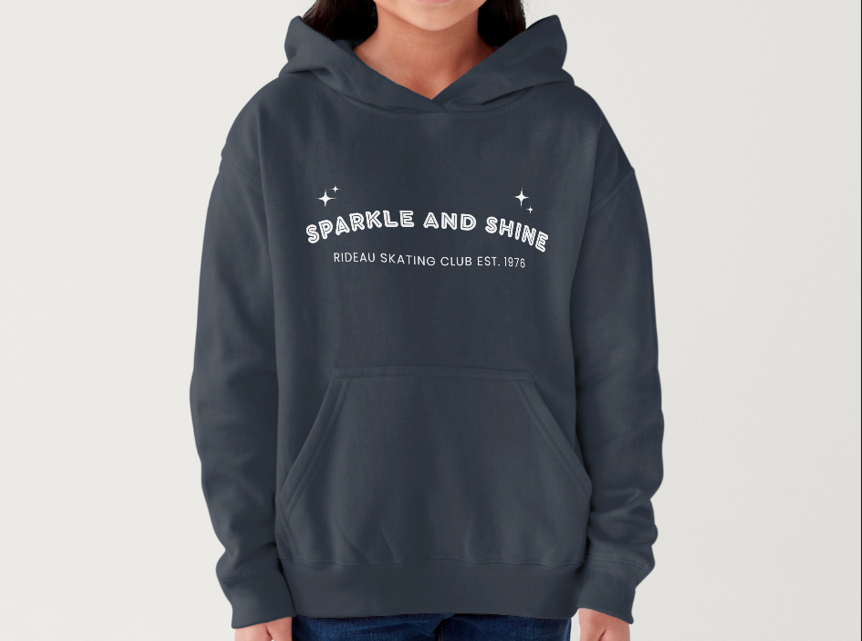 $55.00| Description: 2025 Club Wear YOUTH Hoodie NAVY Sizes: XS-XL Sizing: LINK FRONT: Sparkle and Shine on chest, Rideau Skating Club Est. 1976 written underneath